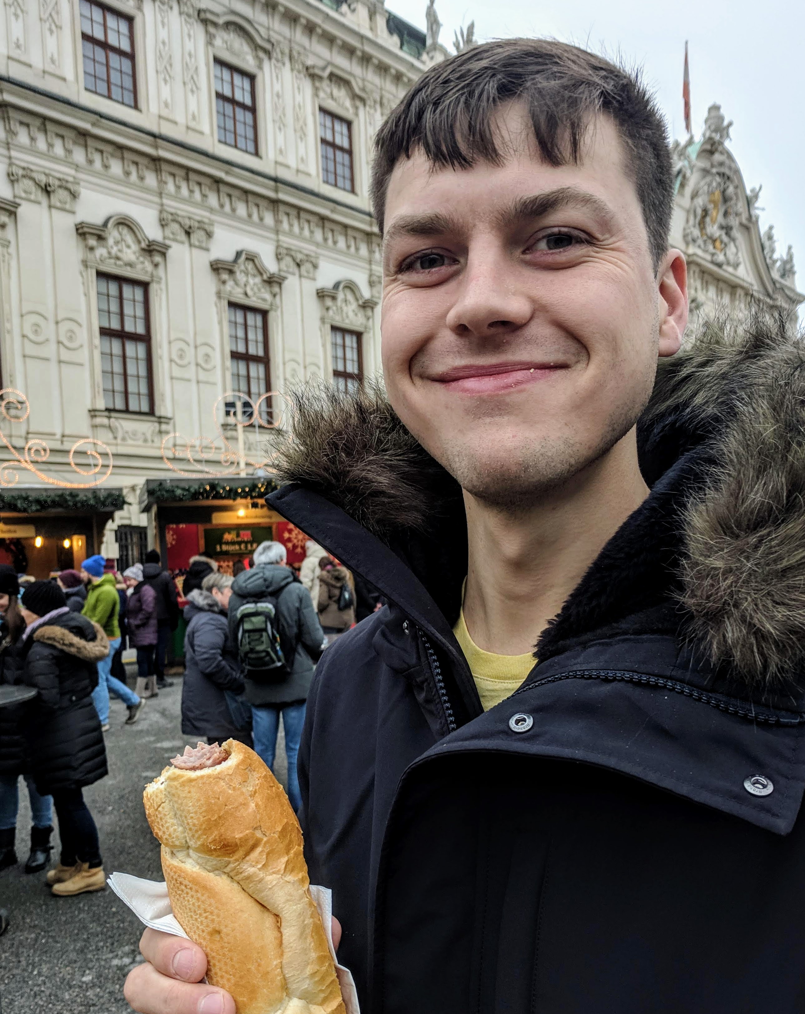 The Christmas market located closest to where we were staying was the one at the historic Belvedere Palace. At this market we discovered the Viennese hot dog. Rather than splitting the bread roll in half longways in the usual fashion, they stick one end of the roll on a metal skewer that puts a hot-dog-sized hole through the bread, without coming through the other end. Then they squirt mustard and ketchup down the hole and put the sausage in. Ingenious.