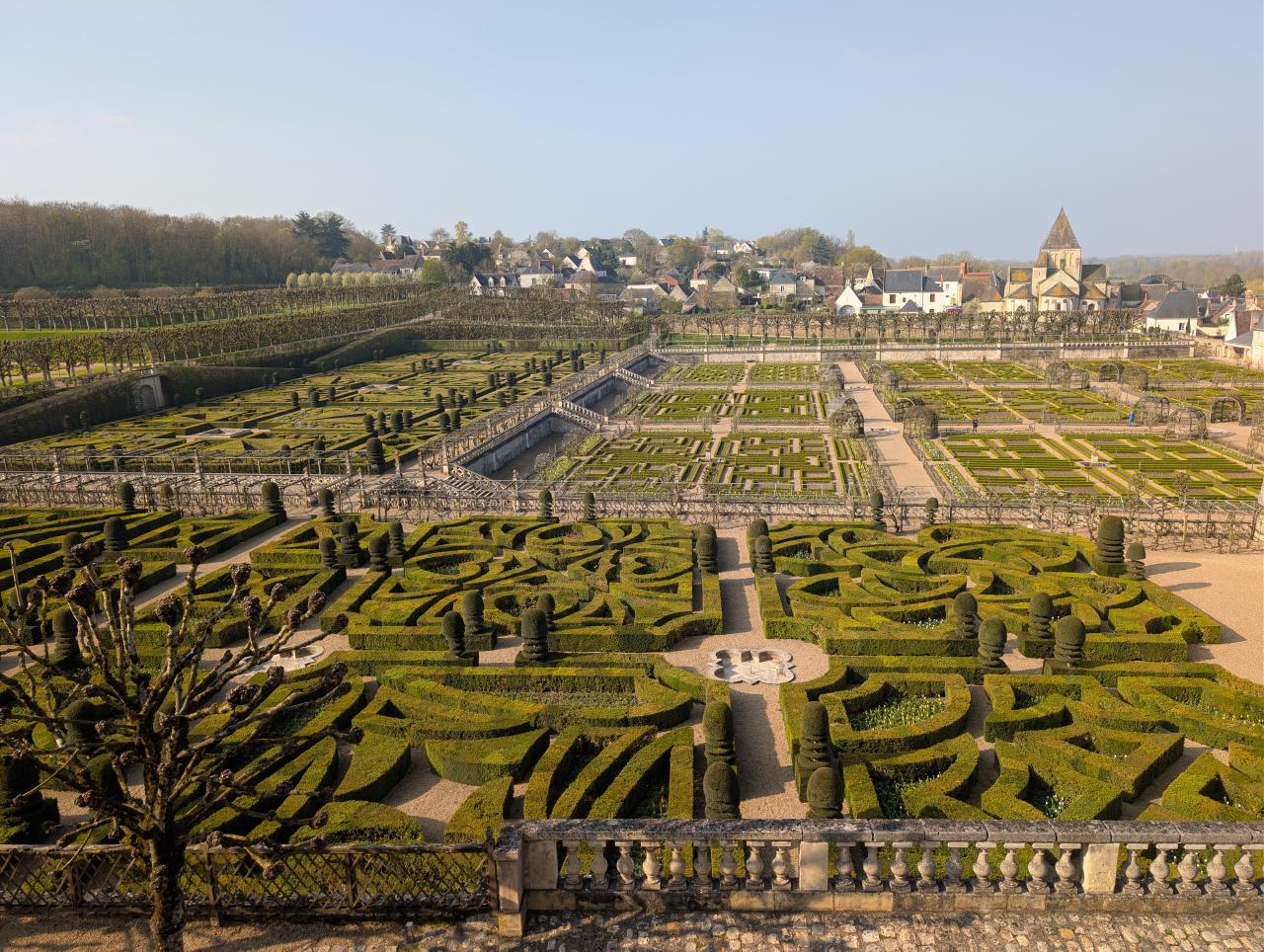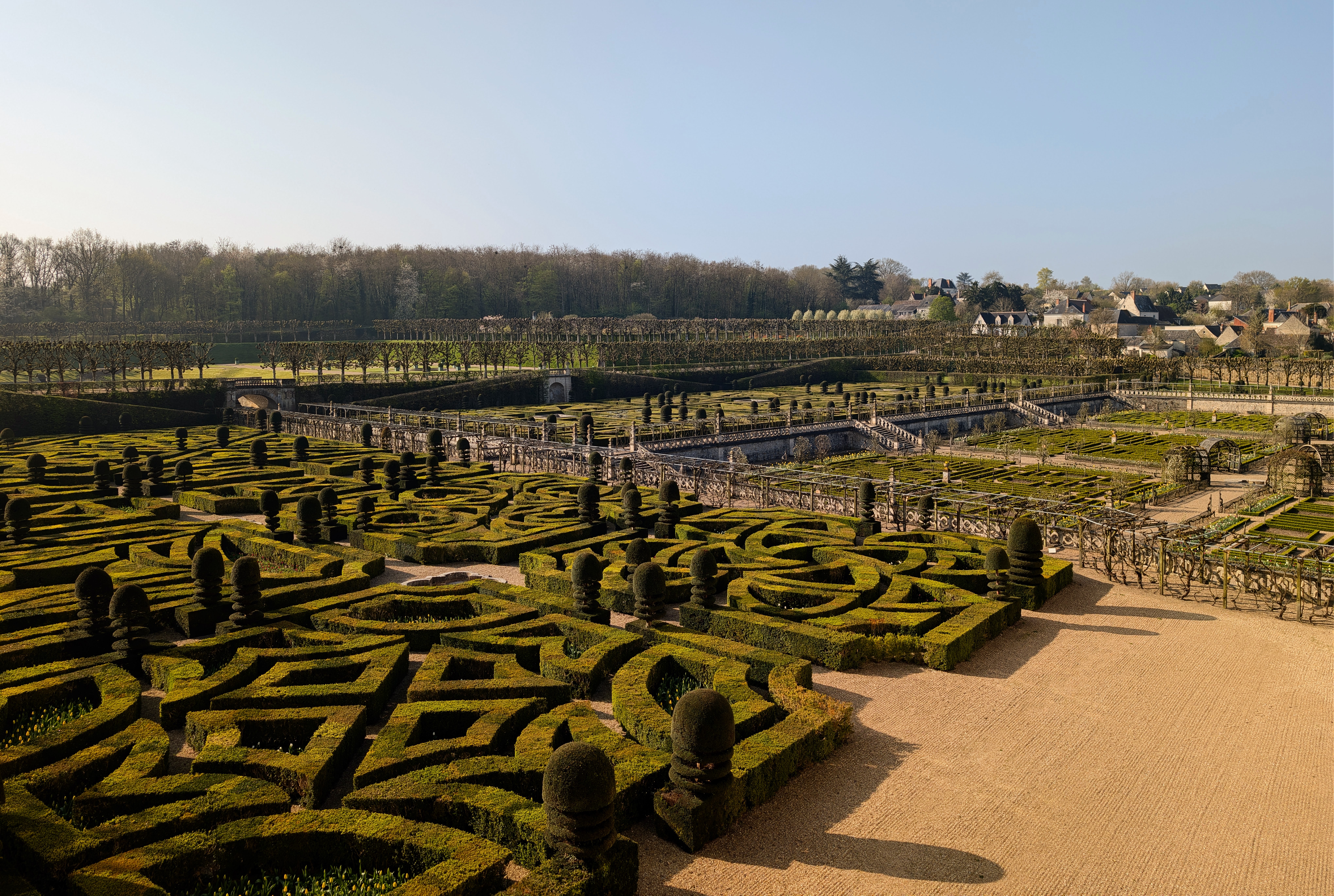 The gardens at Villandry are laid out on three terraces and feature a water garden, an ornamental vegetable garden, as well as a maze and a forest. Nine gardeners work full-time on the 1,200 linden trees, nine hectares of gardens, and 52km of hedges.